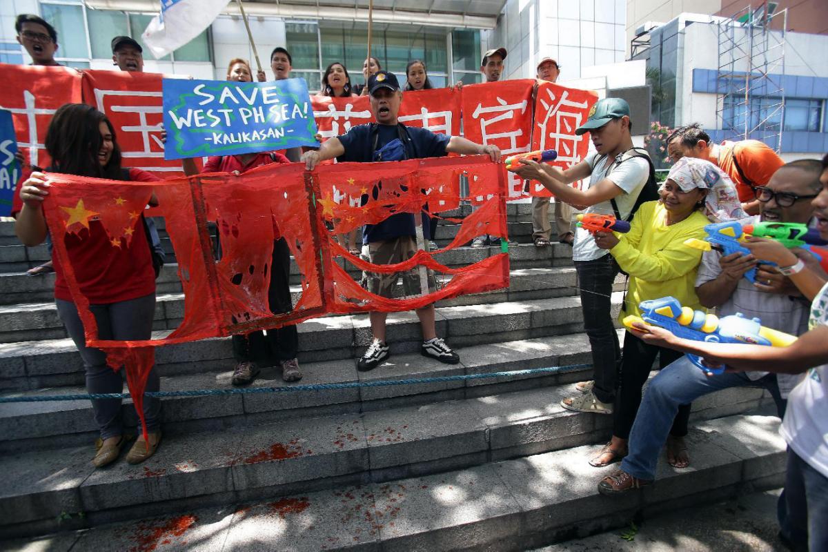 Filipino environmental activists aim water guns at mock Chinese flags as they stage a rally outside the Chinese Consulate in suburban Makati, south of Manila, Philippines on Monday, May 11, 2015 to protest against the continued building of infrastructures along a disputed group of islands known as the Spratlys in the South China Sea. The group is accusing the Chinese military of destroying the fragile ecosystem and livelihood of fishermen during their reclamation projects in the area which both countries have claimed ownership. (AP Photo/Aaron Favila)