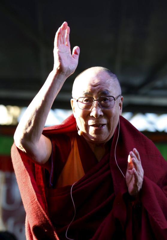 Exiled Tibetan spiritual leader the Dalai Lama acknowledges the audience at a school in Katoomba, west of Sydney, during his first public appearance on his current visit to Australia June 8, 2015. REUTERS/Jason Reed