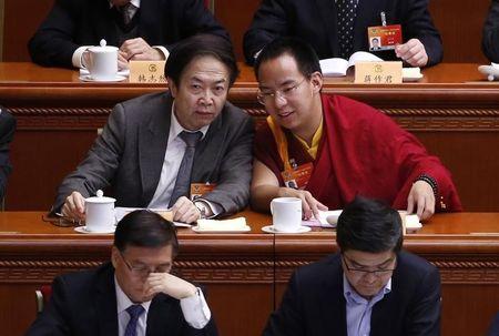 Gyaltsen Norbu (R), the 11th Panchen Lama, speaks with a delegate ahead of the opening of the third plenary meeting of Chinese People’s Political Consultative Conference (CPPCC) at the Great Hall of the People in Beijing, March 11, 2015. REUTERS/Kim Kyung Hoon