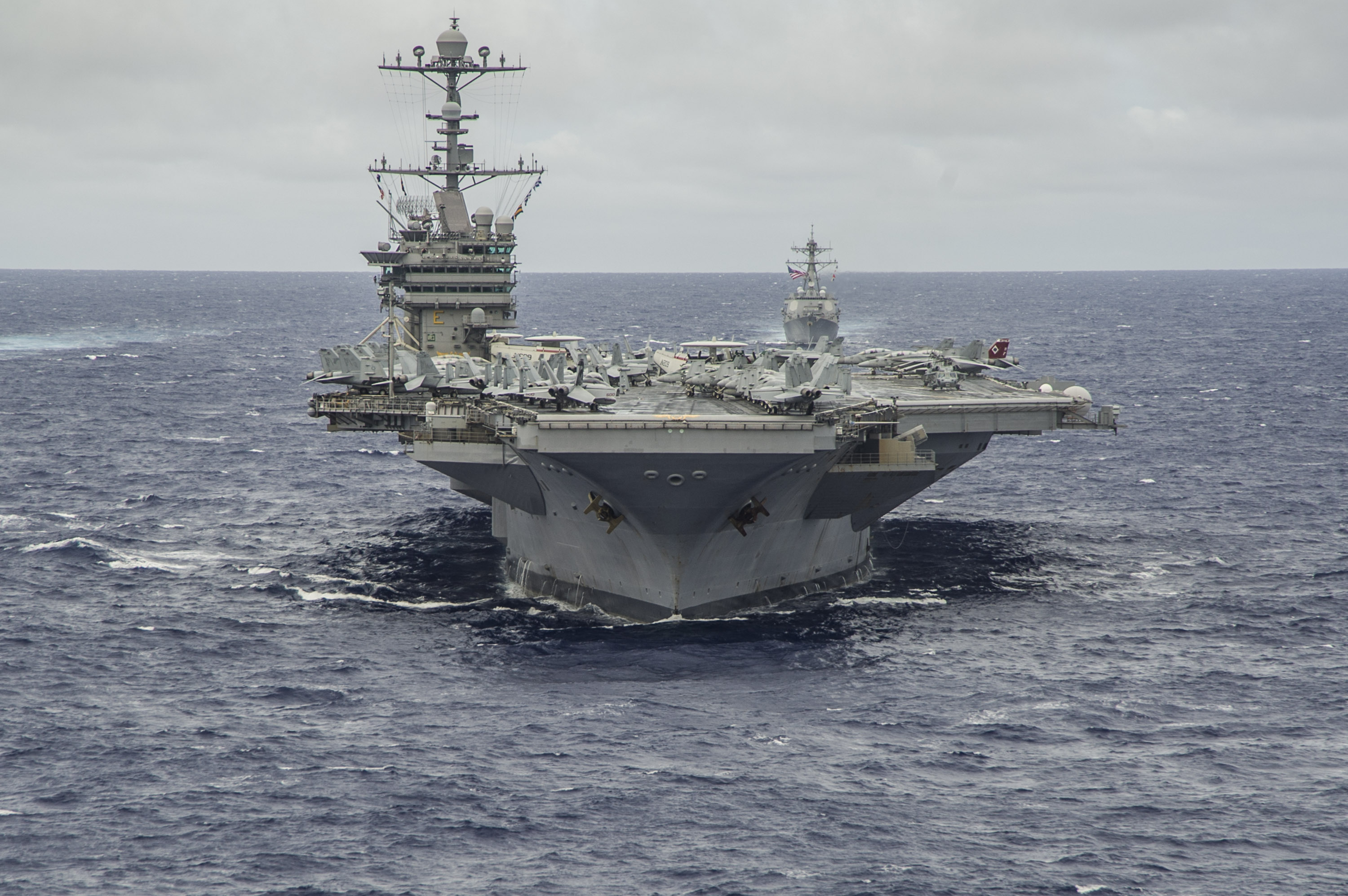 PACIFIC OCEAN (Sept. 23, 2014) The Nimitz class aircraft carrier USS George Washington (CVN 73) is underway in formation at the conclusion of Valiant Shield 2014. The U.S. only exercise integrates Navy, Air Force, Army, and Marine Corps assets and offers real world joint operational experience to develop capabilities that provide a full range of options to defend U.S. interests and those of its allies and partners. (U.S. Navy photo by Mass Communication Specialist 1st Class Trevor Welsh/Released)