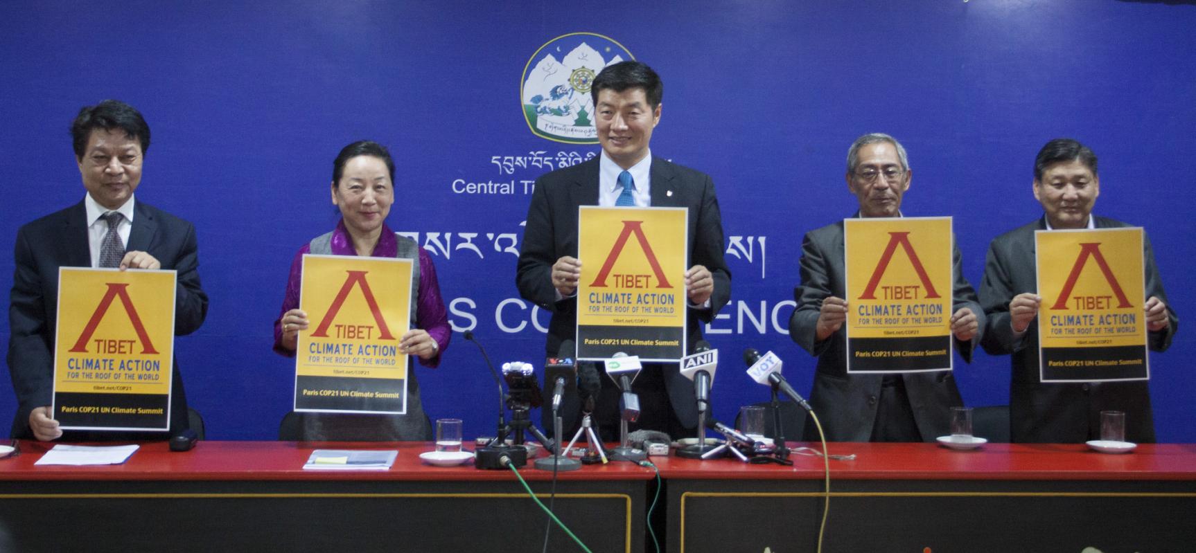 Prime minister of the Tibetan government in exile, Lobsang Sangay, center flanked by government officials unveils the Tibet Climate Action poster during the launch of a campaign in Dharamsala, India, Tuesday, Oct. 20, 2015. The Dalai Lama on Tuesday urged the worlds nations to take strong action to limit global warming and to protect fragile environments including the Himalayan glaciers and Tibetan plateau.(AP Photo/Shailesh Bhatnagar)