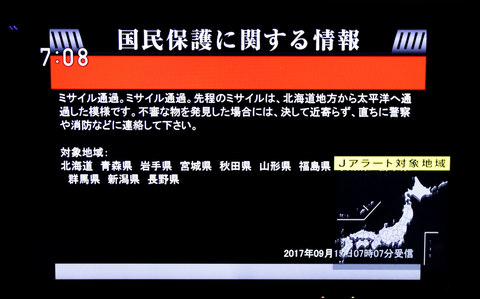 The Japanese government’s alert message called J-alert notifying citizens of a ballistic missile launch by North Korea is seen on a television screen in Tokyo Credit: Reuters