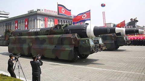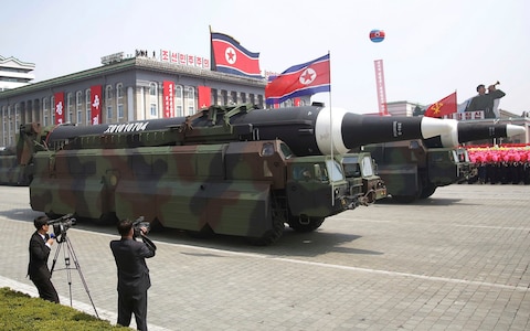 A North Korean Hwasong 12missile is paraded across Kim Il Sung Square during a military parade in Pyongyang Credit: AP