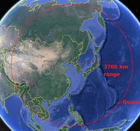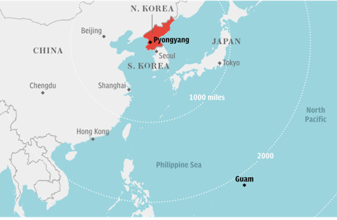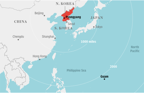 The distance from Pyongyang to Guam is a little over 2,100 miles and North Korea identified it as a target in early August, threatening to launch four Hwasong-12 intermediate-range ballistic missiles into waters close to the island.