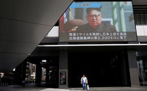 A passerby walks under a TV screen reporting news about North Korea’s missile launch in Tokyo Credit: Reuters