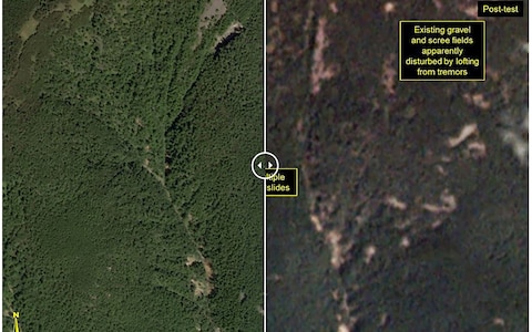 This before-and-after images courtesy of Planet, show a closer view of the Punggye-ri test site Credit: AFP