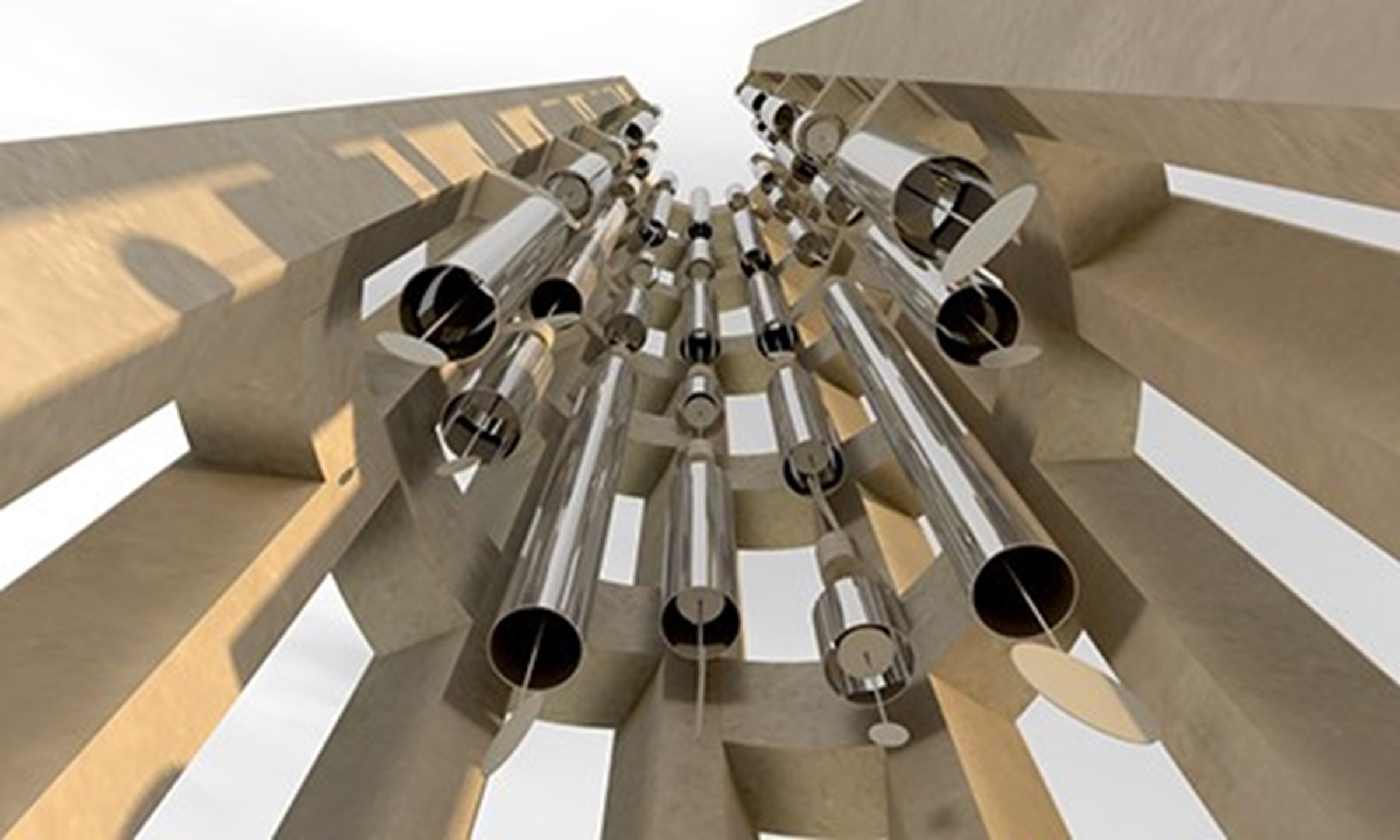 The wind chimes inside the Tower of Voices. The chimes will be constructed of polished aluminium tubes ranging 8-16 inches in diameter and approximately five to ten feet in length. The size of each chime is dependent on the musical note and associated frequency that it is intended to produce.