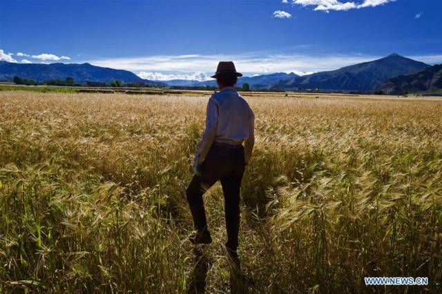 A farmer inspects highland barley in Lhaze County of Xigaze,Tibet, Sept. 13, 2018. The highland barley in Tibet is entering harvest season. (Xinhua/Purbu Zhaxi)