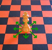 The popular game of Chess is played on a Chessboard by two players each with 16 pieces. The game pieces have varying abilities of movement over the Chessboard. The piece identified as ‘King’ can move in all directions but can only move by one space during a given move.