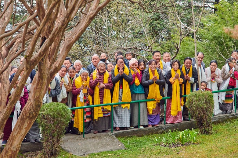 Around 300 devotees line up early at Tsuglagkhang temple to offer the Dalai Lama traditional khata scarves and to receive his blessing.