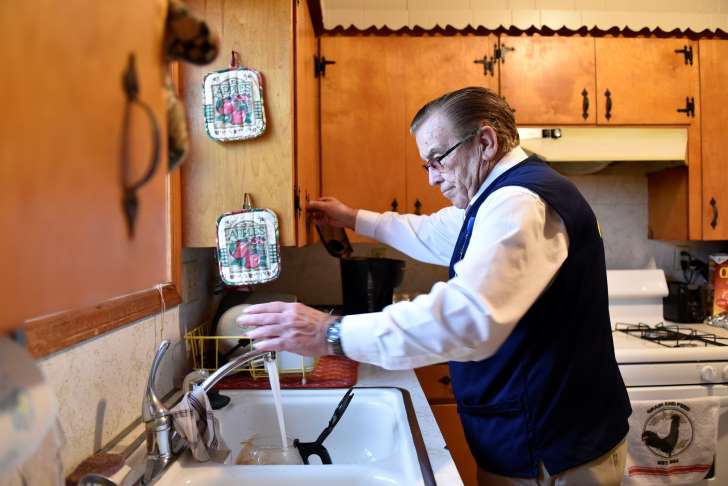 © NICK OXFORD/Nick Oxford for The Washington Post Tom Coomer makes a pot of coffee at his home in Wagoner, Okla., after a day of work at Walmart. So here he is at 79, working full time at Walmart. During each eight-hour shift, he stands at the store entrance greeting customers, telling a joke and fetching a “buggy.” Or he is stationed at the exit, checking receipts and the shoppers that trip the theft alarm.