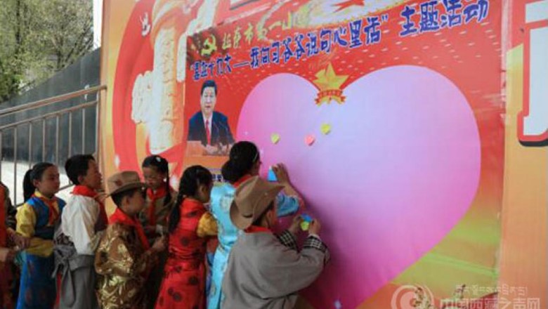 It’s also never too early to start indoctrinating people in this mindset: photos from primary schools in Lhasa, the capital of Tibet, show children “speaking [their] hearts to Grandpa [President] Xi.” One is captioned, “The words of the heart spelled out in…small notes.”