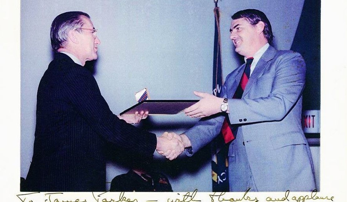 James Parker (right) received the CIA’s Intelligence Medal of Merit from CIA Director William Colby in 1975. This photograph is signed: “To James Parker – with thanks and applause for a job well done in Vietnam. William Colby.