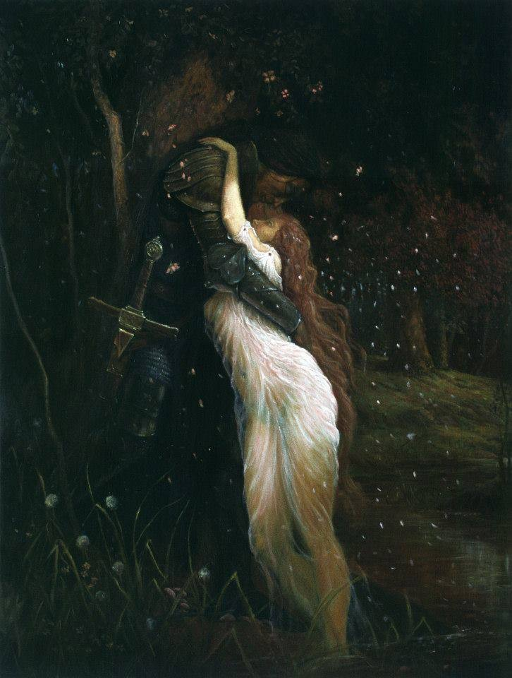 Sure enough, we learn later that she loves him truly: she tells him plainly enough. Or does she? She speaks the words ‘I love thee true’, but ‘in language strange’ (presumably her own faery language), and this information is being related to us by the knight, who may have been hearing what he wanted to hear. (She swore she loved me, honest, she just came out and said it: ‘I love thee true.’) Whether he can even speak or understand her ‘language strange’ remains unknown, but the fact that he describes it as a ‘strange’ language invites reasonable doubt.
