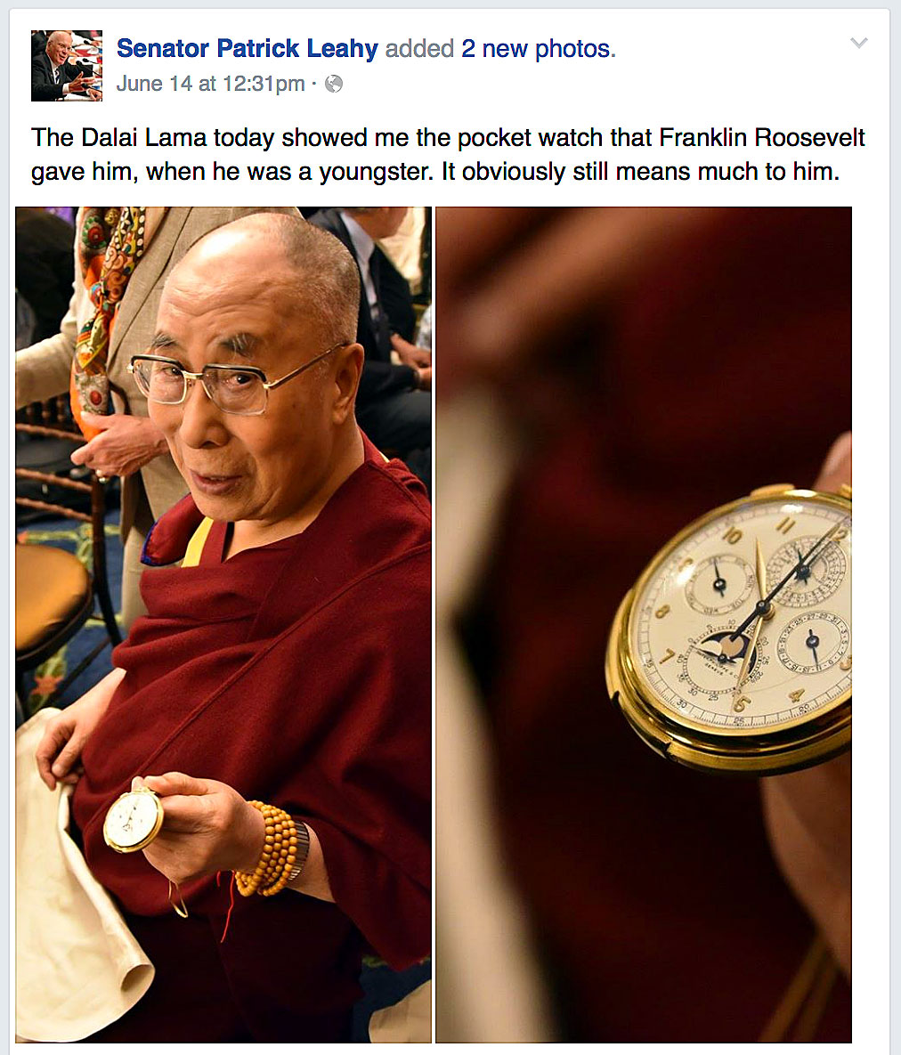 Senator Patrick Leahy showcased the Dalai Lama’s Patek Philippe in a Tweet on Twitter Today, as seen below.