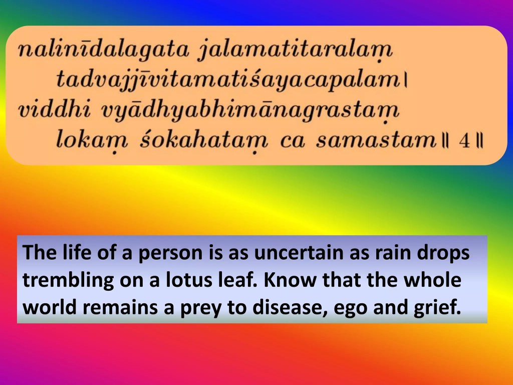 The life of a man is as uncertain as rain drops trembling on a lotus leaf. Know that the whole world remains a prey to disease, ego and grief.