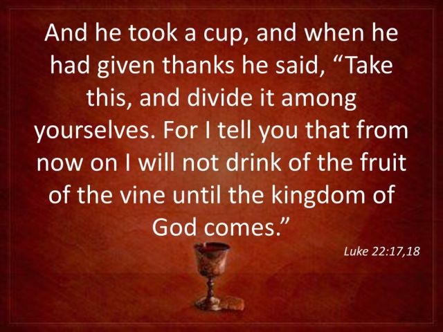 In the New Testament Book of LUKE, Chapter 22, verse 18, Jesus explicitly states, “For I tell you I will not drink again of the fruit of the vine until the Kingdom of God comes.” In my view, there is no fulfillment of Communion without the fulfillment of the Law of Love that demands man to Love One Another.