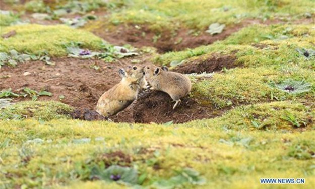 Two plateau pikas (Ochotona curzoniae) frolic by a lakeside on the Qinghai-Tibet plateau in Maizhokunggar County, Tibet. July 6, 2019.(Photo: Xinhua)