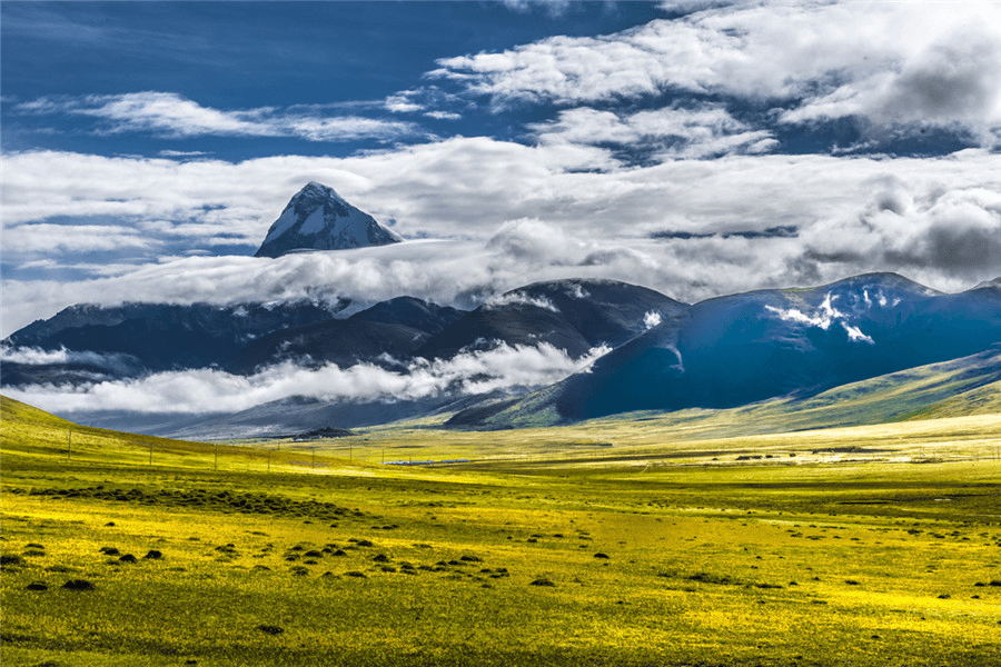 The photo was taken on June 20, 2019, shows the scenery of Mount Chomolhari and wetland in Tsang Province, Dromo County of Shigatse City, Tibet. (Xinhua/Li Xin)