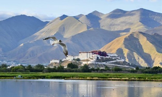 A brown-headed gull flies over Lhalu wetland in Lhasa, June 27, 2019. Lhalu wetland national nature reserve is known as “the Lung of Lhasa”. (Xinhua/Zhang Rufeng)