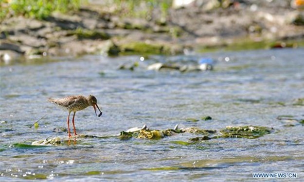 A common redshank is seen at Lhalu wetland in Lhasa, June 27, 2019. Lhalu wetland national nature reserve is known as “the Lung of Lhasa”. (Xinhua/Zhang Rufeng)