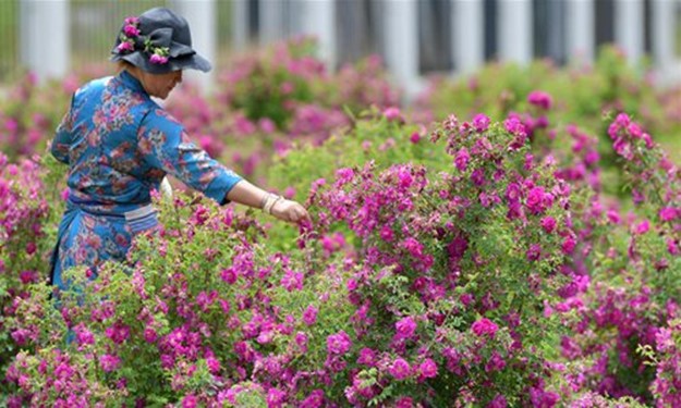A tourist picks petals from flowers at a garden of an agricultural industrial park in Dagze District of Lhasa. June 9, 2019. The garden covering an area of 200 mu (13.3 hectares) has become a rural tourist destination and a way of increasing income for local villagers. (Photo: Xinhua)