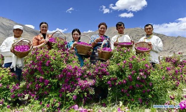 Tourists and staff members display petals picked from flowers at a garden of an agricultural industrial park in Dagze District of Lhasa. June 9, 2019. The garden covering an area of 200 mu (13.3 hectares) has become a rural tourist destination and a way of increasing income for local villagers. (Photo: Xinhua)