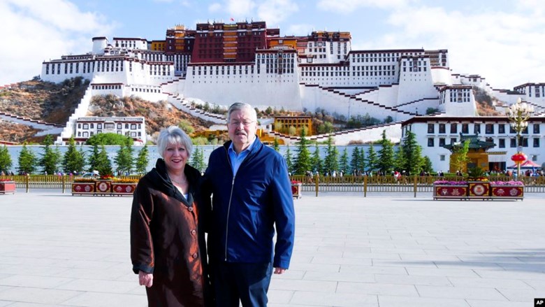 U.S. Ambassador to China Terry Branstad and his wife, Christine, pose in front of the Potala Palace in Lhasa in western China’s Tibet Autonomous Region, May 22, 2019.