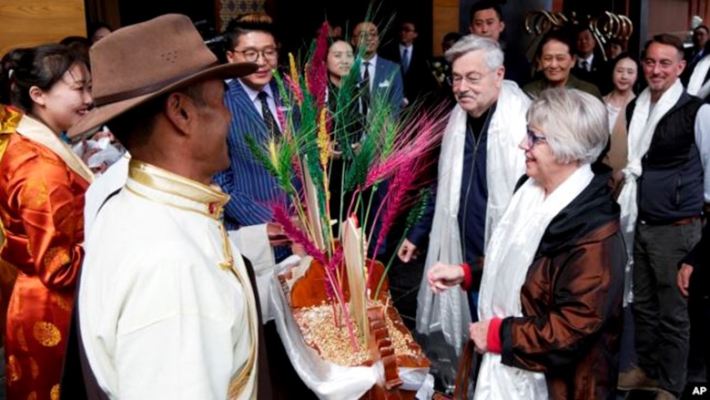 U.S. Ambassador to China Terry Branstad and his wife, Christine, are greeted in Lhasa in western China’s Tibet Autonomous Region, May 21, 2019. Branstad made a rare visit to Tibet to meet local officials and raise concerns about restrictions on Buddhist practices and the preservation of the Himalayan region’s unique culture and language.