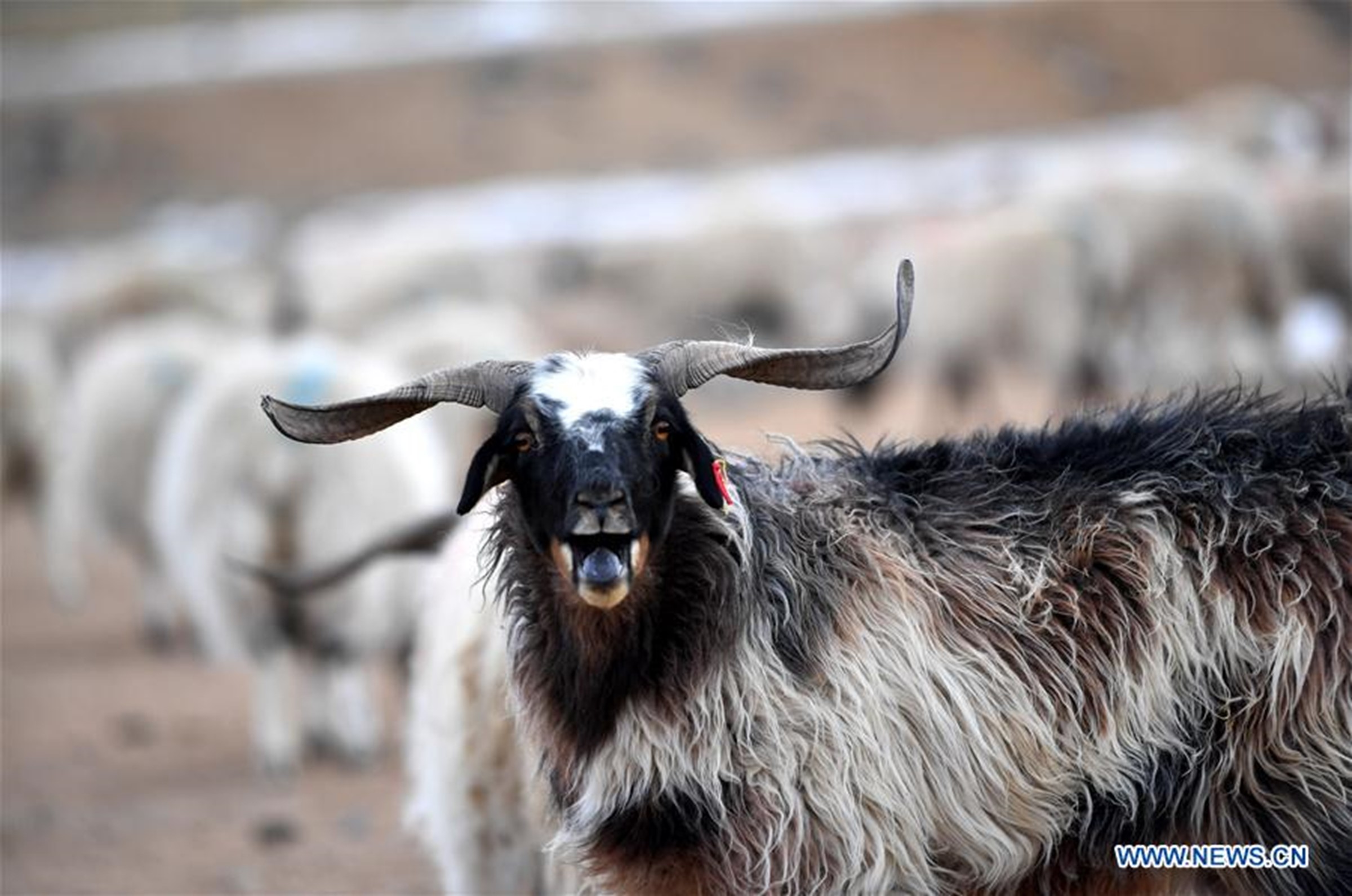 A sheep is seen at a herdsman resettlement site in Bange County, Tibet, Jan. 17, 2019. In the past, herdsmen in Tibet endured a ridiculously long, cold winter from October to the end of June, before moving to the summer meadow. They had no fixed residence and migrated when the seasons changed, taking their tents, kitchen utensils, and other necessities on horseback. Nowadays, most herdsmen benefit from local resettlement program. (Xinhua/Chogo)