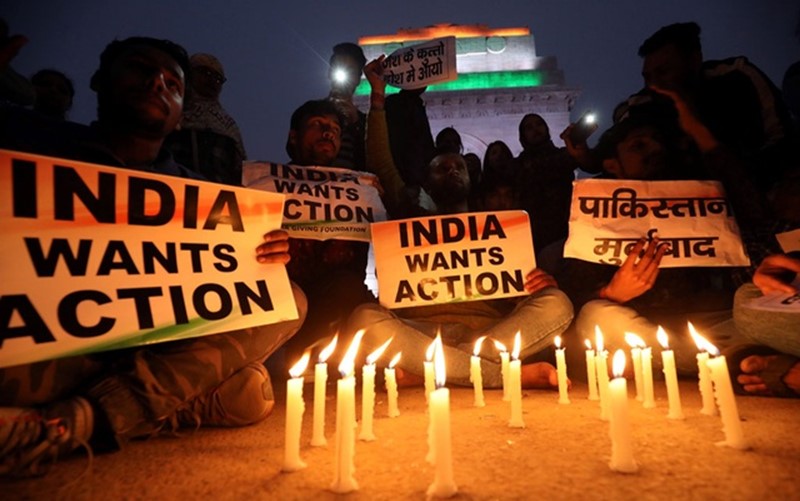 People attend a candle light vigil to pay tribute to Central Reserve Police Force (CRPF) personnel who were killed after a suicide bomber rammed a car into the bus carrying them in south Kashmir on Thursday, in front of India Gate war memorial in New Delhi, India, Feb. 15, 2019. REUTERS/Anushree Fadnavis