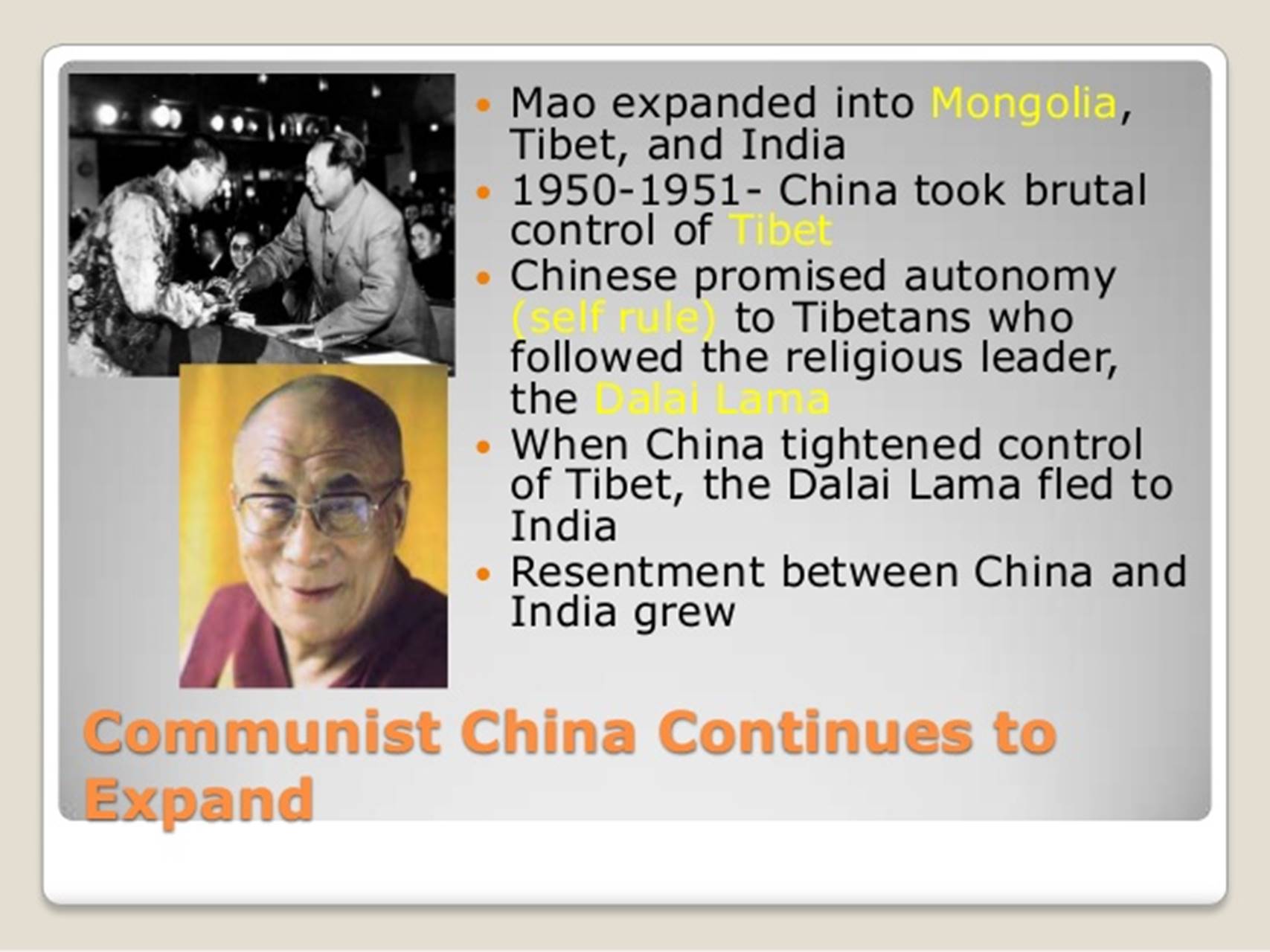 The most serious cause of discord was the invasion of Tibet by the Chinese “Liberation Army” in October 1950.