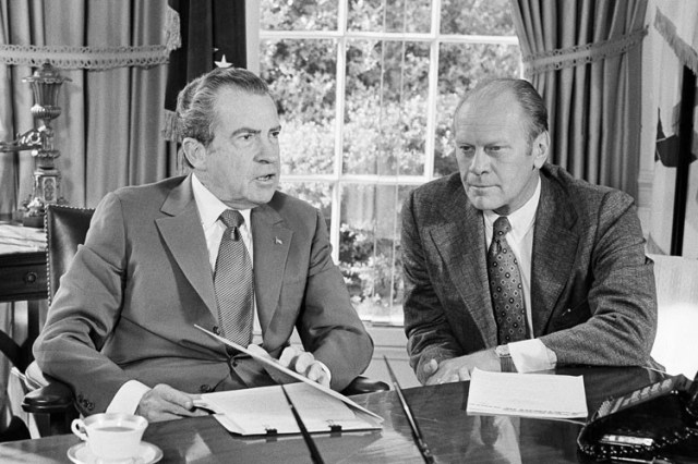 The Watergate scandal erupted after it was revealed that Nixon and his aides had engaged in illegal activities during his reelection campaign–and then attempted to cover up evidence of wrongdoing. With impeachment proceedings underway against him in Congress, Nixon bowed to public pressure and became the first American president to resign. At noon on August 9, Nixon officially ended his term, departing with his family in a helicopter from the White House lawn. Minutes later, Vice President Gerald R. Ford was sworn in as the 38th president of the United States in the East Room of the White House. After taking the oath of office, President Ford spoke to the nation in a television address, declaring, “My fellow Americans, our long national nightmare is over.”