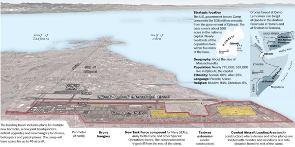Elsewhere in Djibouti, the US military operates the Chabelley Airfield, from which the Pentagon stages drone airstrikes, likely into Somalia and across the Bab el-Mandeb Strait into Yemen, according to the Center for the Study of the Drone at Bard College in New York. The Pentagon is investing millions in the base, and satellite photos show several construction projects, the center reported last year.