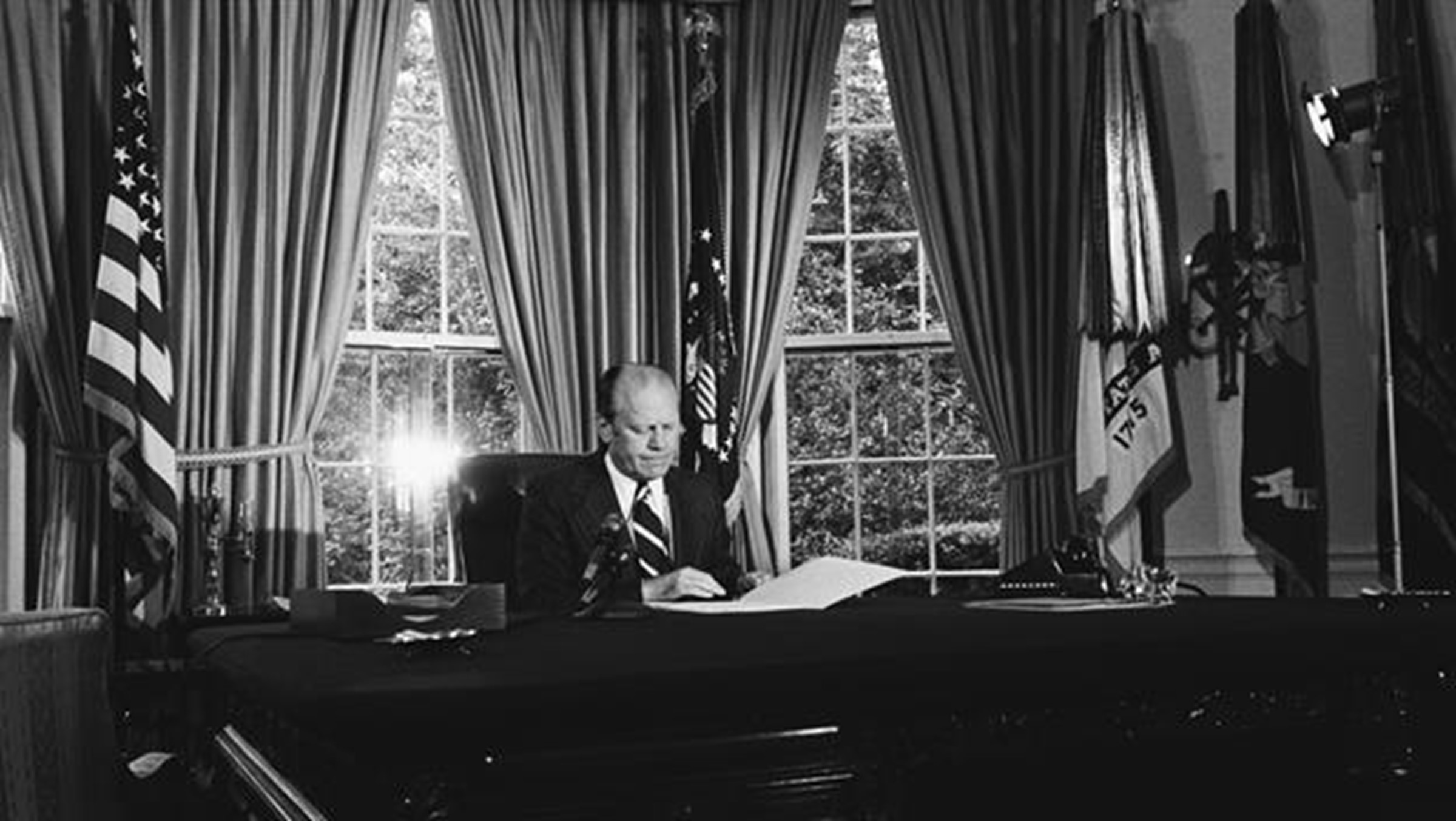 Minutes later, Vice President Gerald R. Ford was sworn in as the 38th president of the United States in the East Room of the White House. After taking the oath of office, President Ford spoke to the nation in a television address, declaring, “My fellow Americans, our long national nightmare is over.”