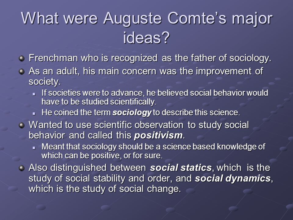 Whole Spirituality – Whole Positve: Frenchman who is recognized as the father of sociology. As an adult, his main concern was the improvement of society. If societies were to advance, he believed social behavior would have to be studied scientifically. He coined the term sociology to describe this science. Wanted to use scientific observation to study social behavior and called this positivism. Meant that sociology should be a science based knowledge of which can be positive, or for sure. Also distinguished between social statics, which is the study of social stability and order, and social dynamics, which is the study of social change.
