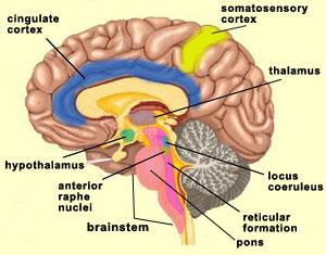 Reticular Formation is shown as a single ‘red’ bar in this figure. It consists of numerous Brain Stem nuclei. It is a network of nerve pathways and nuclei throughout the Brain Stem. A single neuron in this network may have synapses/connections with as many as 25,000 other neurons/nerve cells.The two components of Consciousness: 1.Capacity for consciousness is an upper Brain-Stem Function and 2. the Content of consciousness is a Function of the Cerebral Cortex. The Reticular Formation which is located in the central Brain Stem helps to coordinate and integrate actions of different parts of the Central Nervous System such as regulation of muscle and reflex activity;central transmission and composition of sensory impulses; respiration; cardiovascular responses; behavioral arousal; and sleep.