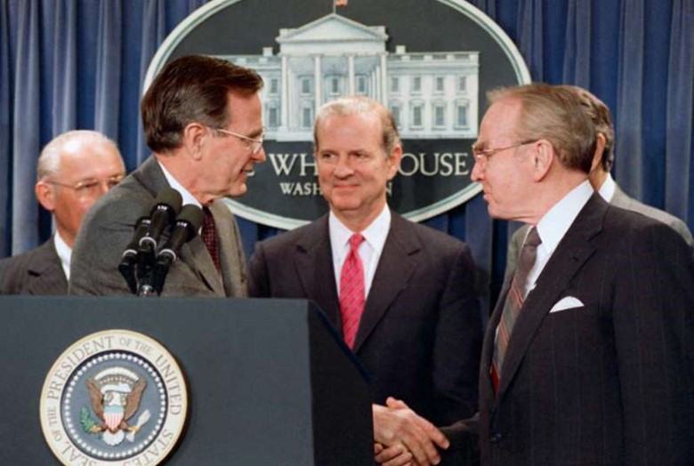 Reagan’s famous maxim that government was not the solution to a problem but the problem itself was not Bush’s view, which might explain why his single term arguably resulted in more significant legislative achievements than Reagan’s two, among them the Americans with Disabilities Act, a bolstered Clean Air Act, and an increased minimum wage.