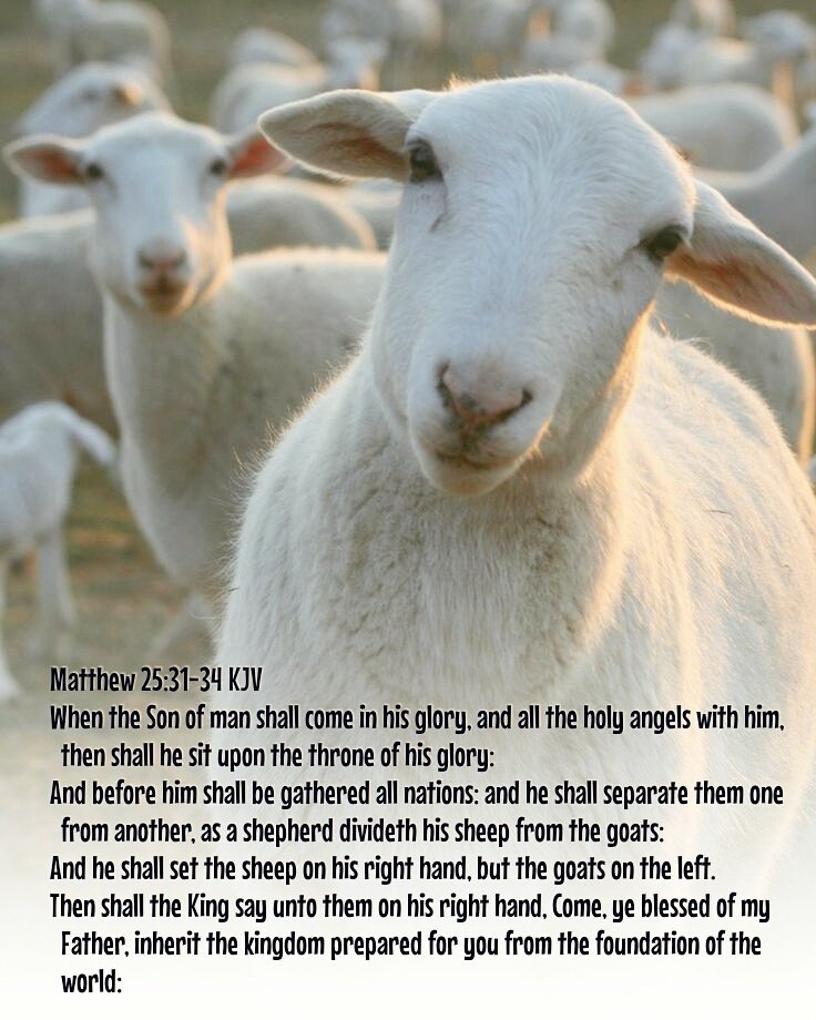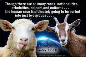 In The New Testament Book Matthew, Chapter 25, Verses 31 to 46, the separation of human beings into Sheep and Goats is fully described. “When the Son of Man comes in His glory, and all the angels with Him, He will sit on His throne in heavenly glory. All the nations will be gathered before Him, and He will separate the people one from another as a shepherd separates the sheep from the goats. The sheep will inherit the Kingdom prepared for them since the creation of the world. The righteous sheep receive the blessings of eternal life. But, the goats are cursed into the eternal fire and they will go away to eternal punishment.”