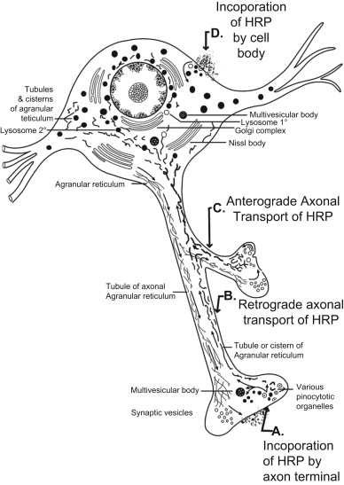 The protein molecules then enter the spaces inside the endoplasmic reticulum of the cell body and subsequently inside the Golgi apparatus, where two changes occur. First, the neuropeptide-forming protein is enzymatically split into smaller fragments, some of which are either the neuropeptide itself or a precursor of it. Second, the Golgi apparatus packages the neuropeptide into minute transmitter vesicles that are released into the cytoplasm. Then, the transmitter vesicles are transported all the way to the tips of the nerve fibers byaxonal streaming of the axon cytoplasm, traveling at the slow rate of only a few centimeters per day. Finally, these vesicles release their transmitter at the neuronal terminals in response to action potentials in the same manner as for small-molecule transmitters. However, the vesicle is autolyzed and is not reused.