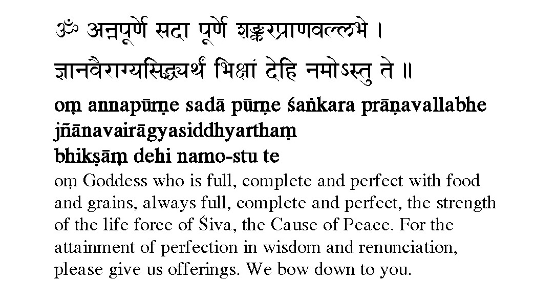 Salutations to Mother Annapoorna: O Mother Annapoorna, You who are always full (with the gift of Food and Blessings), You who are the beloved of Shankara (Shiva), O Mother Parvati, Please grant me the alms of your Grace, to awaken within me Spiritual Knowledge (Jnana) and detachment, freedom from all worldly desires (Vairagya).