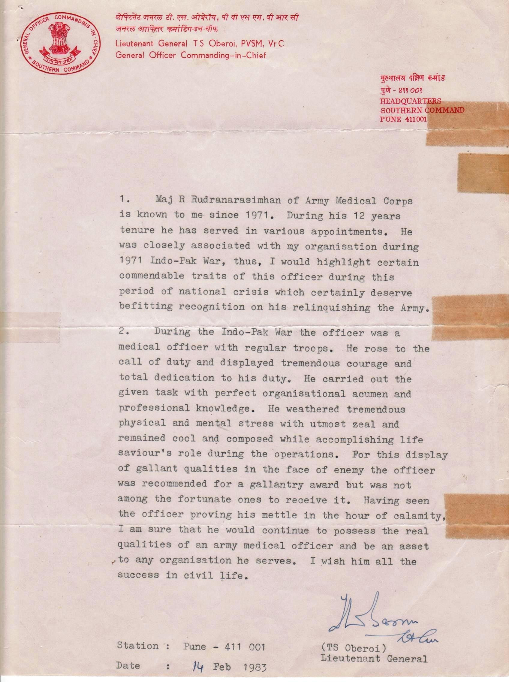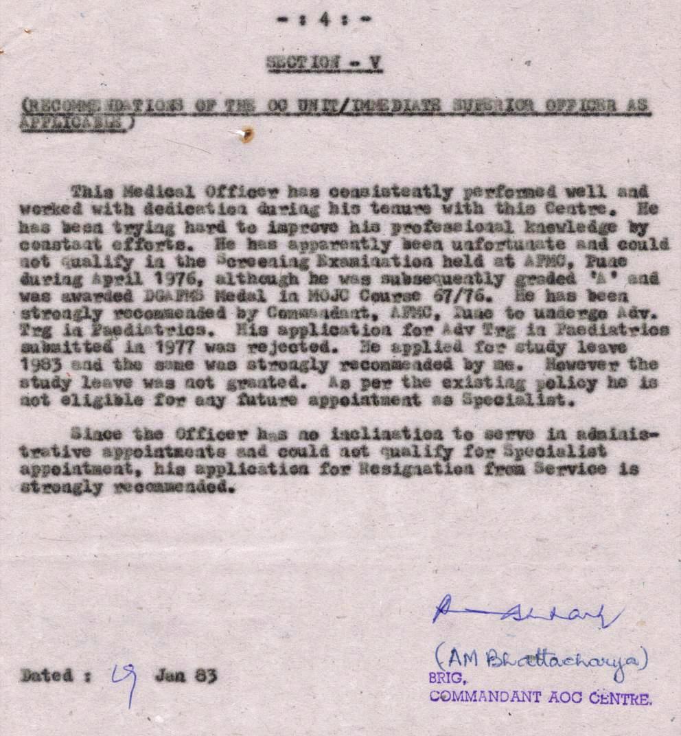 Whole Dude – Whole Flame: Recommendation of Brigadier AM Bhattacharya, Commandant AOC Centre, Secunderabad dated 19 January 1983. During September 1983, he served as the Commander of Central Ordnance Depot, Delhi. He personally briefed Lieutenant General Banerjee, Director of Medical Services (Army) about my personal interview with the Defence Minister on 18 September 1983 and he made arrangements to deliver my second application dated 17 September, 1983 direct to DMS (Army) Office in New Delhi.