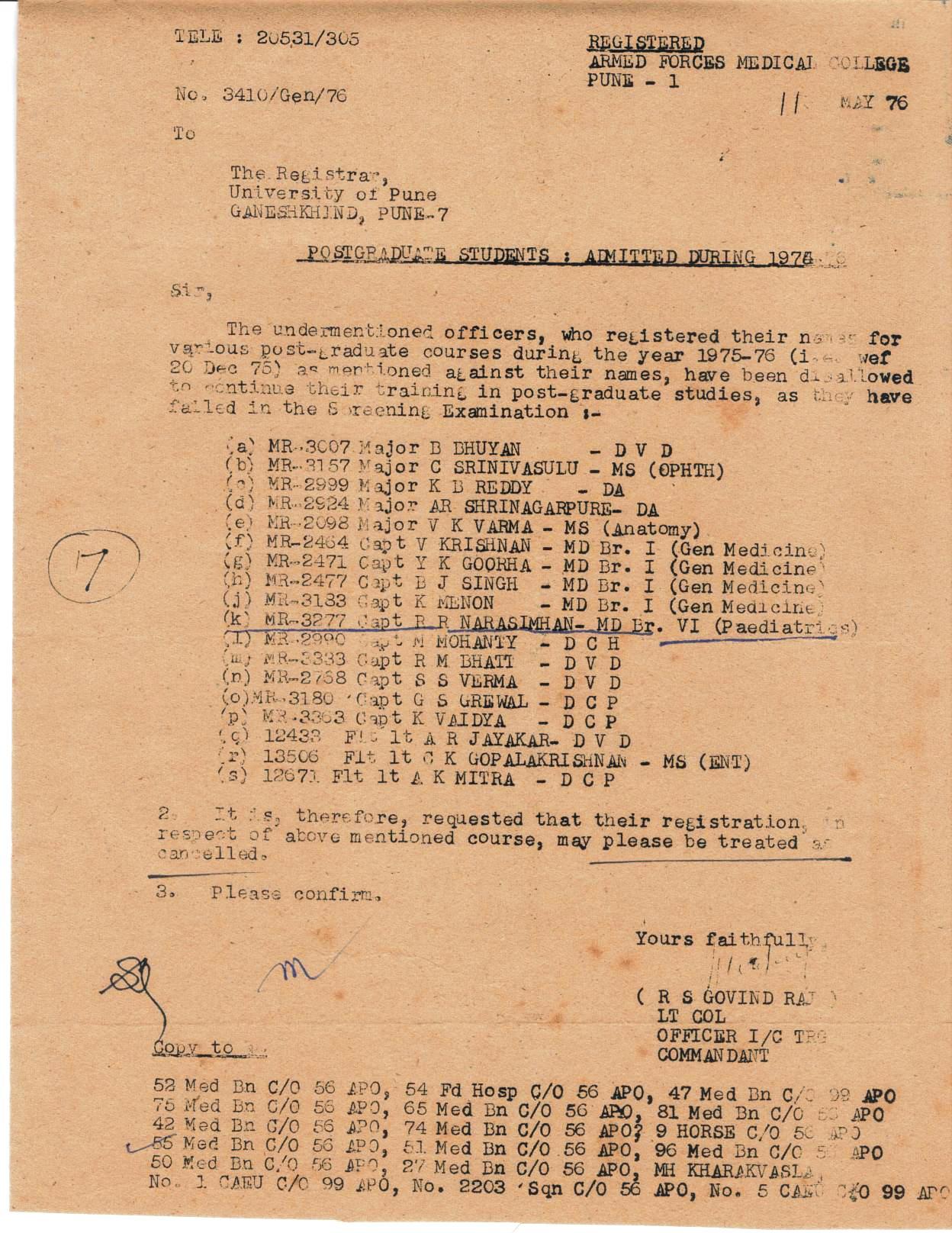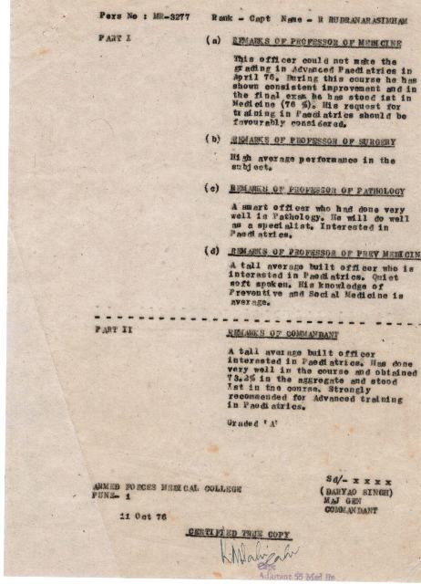 Whole Dude – Whole Flame: The Burning Spirit of Nationalism was instrumental in all the major decisions of my Life. THE DGAFMS MEDAL AWARDED BY ARMED FORCES MEDICAL COLLEGE, POONAApart from awarding this DGAFMS MEDAL in the Medical Officers Junior Command Course-67 held in 1976, The Commandant, the Professor of Medicine, the Professor of Pathology, and the Professor of Social & Preventive Medicine at Armed Forces Medical College, Pune gave a written recommendation that I should be allowed to undergo Training in Paediatrics. Based upon this strong written recommendation, I reapplied for Advanced Training in Paediatrics during 1977 and my application was rejected by Lieutenant General BDP Rao.Whole Dude – Whole Flame: The Burning Spirit of Nationalism was instrumental in all the major decisions of my Life. 67 Medical Officers’ Junior Command Course Report from Armed Forces Medical College, Pune.Major General Daryao Singh, AMC, Commandant of Armed Forces Medical College, AFMC Pune had strongly recommended my name on 11 October 1976 for attending Advanced Training in Paediatrics. Professor of Medicine, Professor of Surgery, Professor of Pathology, and Professor of Preventive Medicine had remarked that I would do well as a Specialist and had noted my interest in Paediatrics. They had personally interviewed me and had evaluated my performance during the MOJC Course.I applied for Advanced Specialist Training in Paediatrics during 1977-79. My application was Strongly Recommended by all Reviewing Officers along the entire length of the Chain of Command. My application was rejected. On 22 October 1977, I submitted a Non-Statutory Complaint against this decision. On 8 December 1977, the Director of Medical Services, Army Headquarters had simply informed me that my Complaint was rejected. No reason was stated. I had no answer about my non-selection for the Specialist Training Course. While rejecting my Complaint, the Director of Medical Services (Army) also made a very surprising decision. The Director also disallowed MR-3363 Captain K VAIDYA from attending the Advanced Specialist Training in Pathology Course 1977-79 after selecting him for that Course. Captain K Vaidya’s name also appears in the letter dated 11 May 1976, the letter sent by Armed Forces Medical College, Pune to The Registrar, University of Pune informing that he had failed in the Screening Examination held in April 1976. I never wanted to harm Captain K Vaidya. The action to reject my Complaint was validated by disallowing Capt K Vaidya from attending the Pathology Training Course. Lieutenant General BDP Rao and Brigadier VVS Pratap Rao during 1977 conspired to exclude my name during the Selection process and obstructed me from attending the Training Course in Paediatrics and Captain K Vaidya became a victim of this Conspiracy.