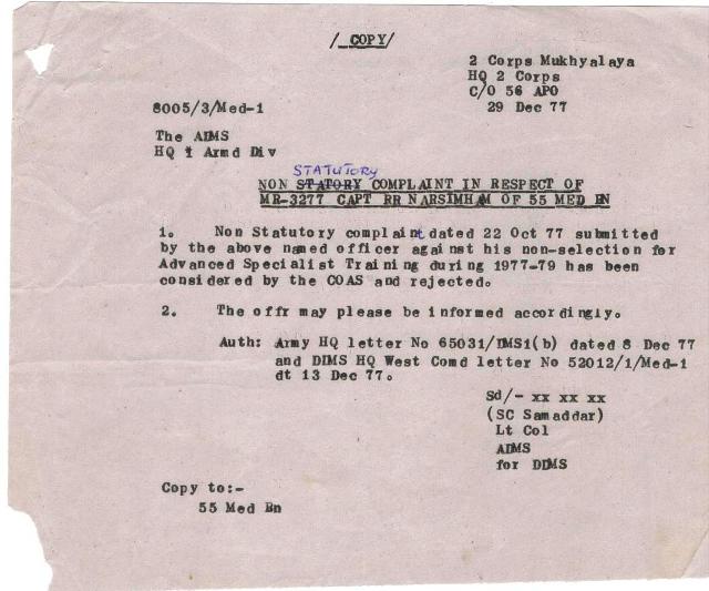 During December 1978, I was posted to Army Ordnance Corps Centre, Secunderabad at the end of my tenure at First Armoured Division. I witnessed the tragic loss of Mrs. Padma Sundarji and shared my comments in a different blog post. While I was posted at First Armoured Division, I again tried to attend ‘The Advanced Training in Paediatrics Course’. Lieutenant General B.D.P. Rao, a fellow South Indian Brahmin continued to delight himself by denying me an opportunity to improve my professional qualification. I had filed a ‘Non-Statutory’ Complaint and it was rejected by the Chief of Army Staff based upon a recommendation given by the Director of Medical Services (Army) who had acted after consulting with the Director General of Armed Forces Medical Services about my Non-Statutory Complaint. I did not bring this problem to the attention of the Defence Minister and had silently endured this insulting and prejudicial conduct to keep my Spirit alive to Serve the Country.