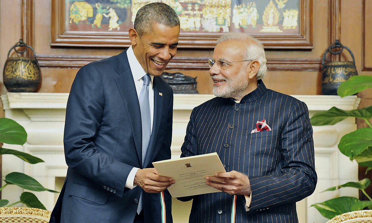 India’s Prime Minister Narendra Modi (R) presents a reproduction of telegram sent by U.S. to the Indian Constituent Assembly in 1946, to U.S. President Barack Obama during their meeting in New Delhi January 25, 2015. In a glow of bonhomie, Obama and Indian Prime Minister Narendra Modi worked on a series of bilateral agreements at a summit on Sunday that both sides hope will establish an enduring strategic partnership. REUTERS/India’s Press Information Bureau/Handout via Reuters.